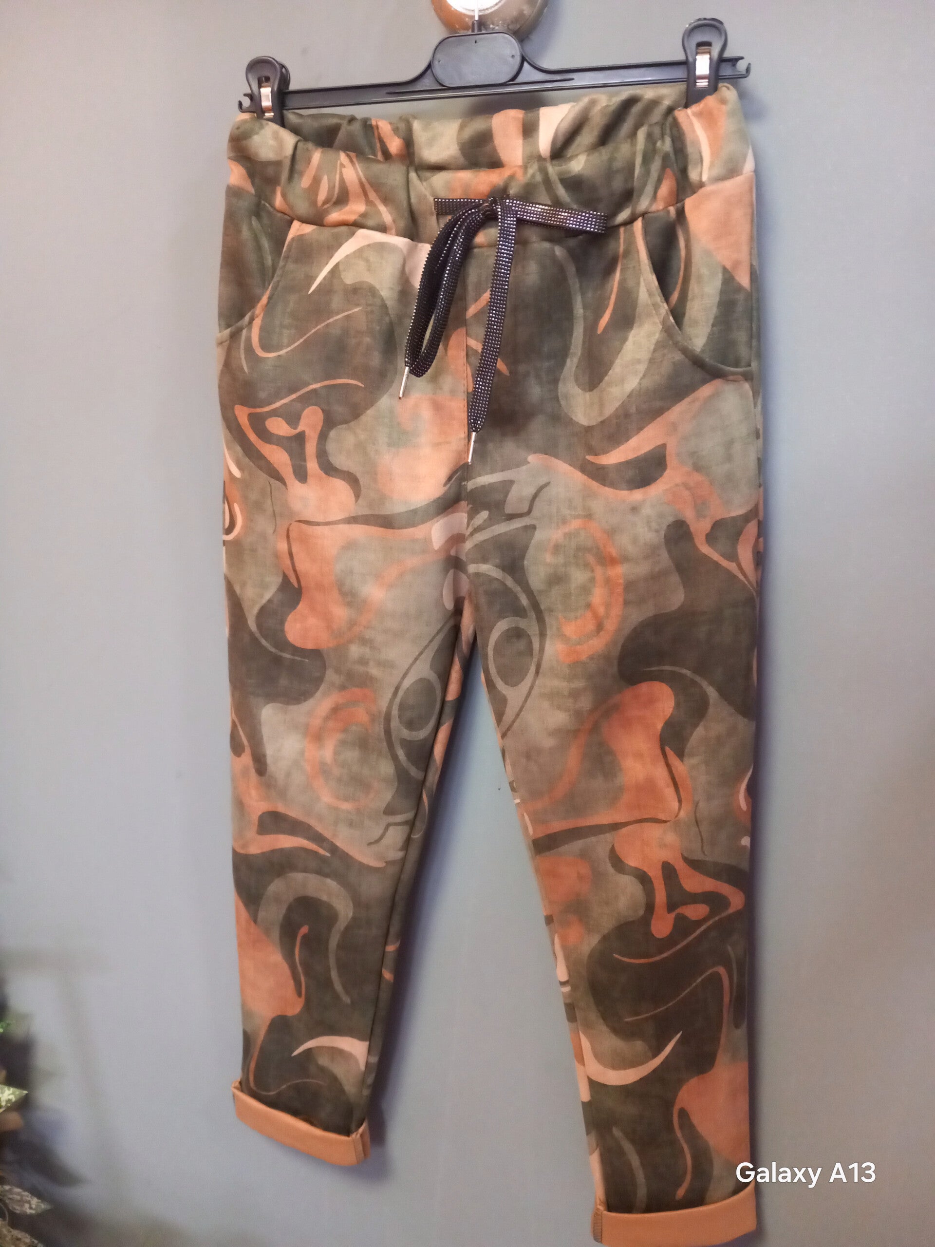 Precioso y original pantalón, efecto terciopelo,bolsillos laterales y cintura elástica.