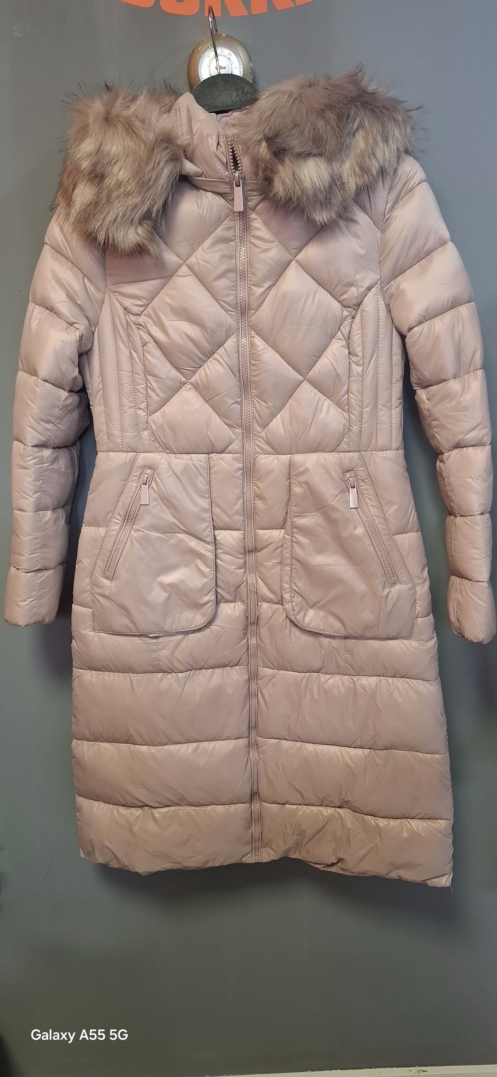 Precioso y original abrigo ,satinado rosa palo, corte entallado,capucha de pelo desmontable y bolsillos laterales.