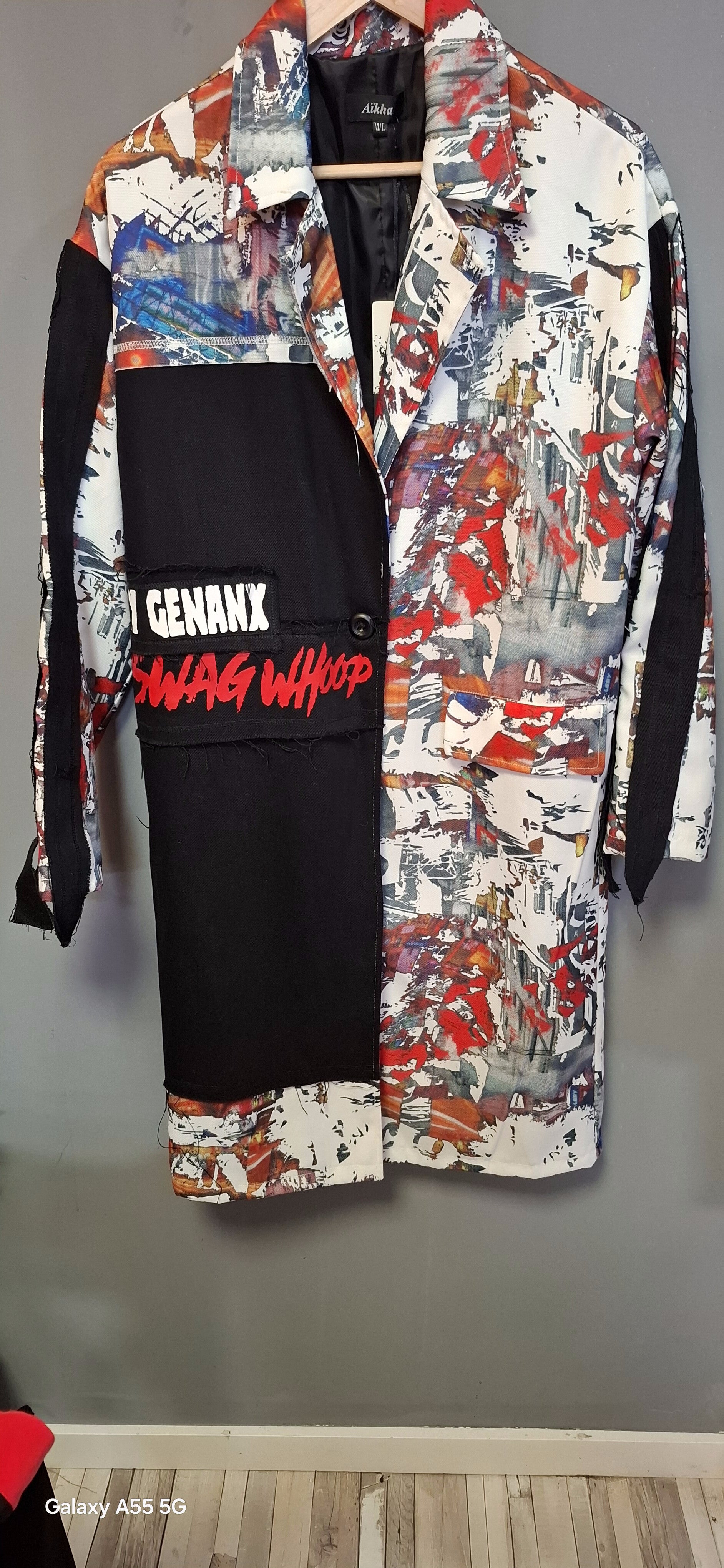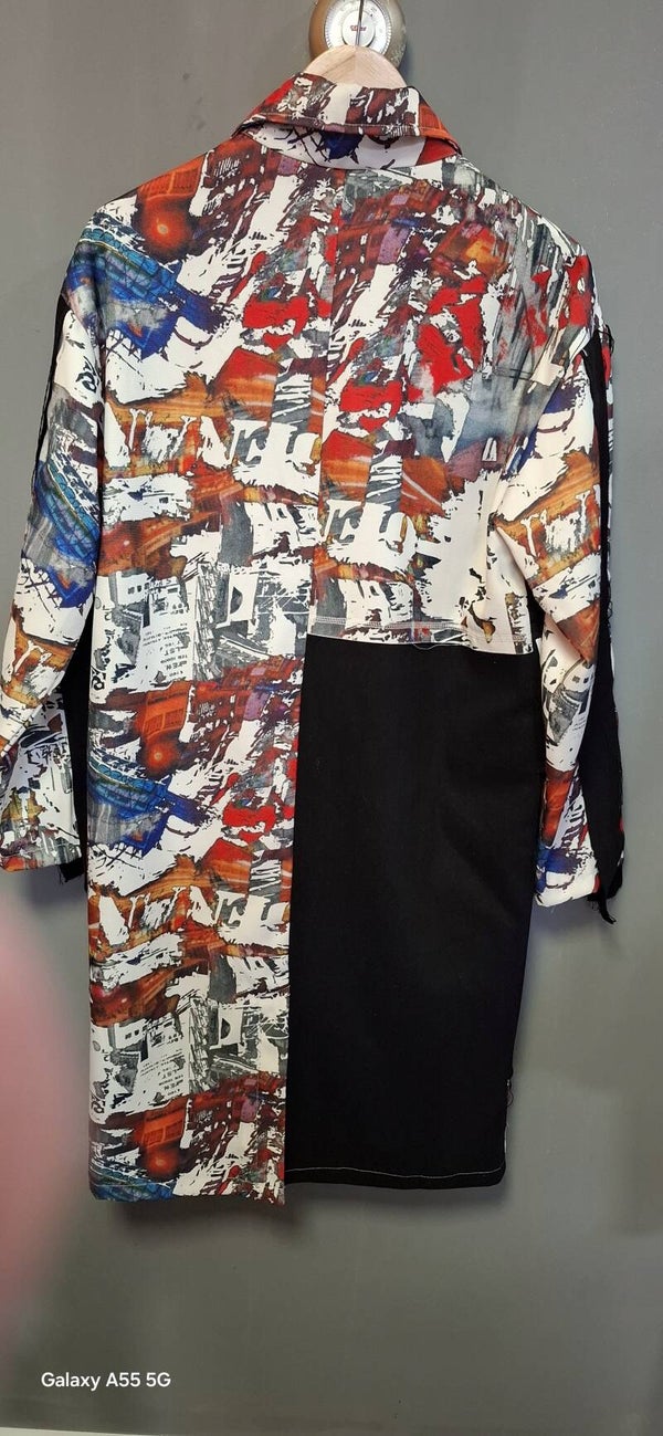Precios y original abrigo,corte asimétrico diferentesparches...botón central .