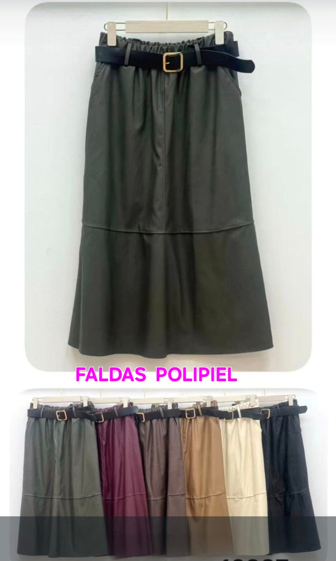 Precios faldas polipel,corte evase, cintura con goma y bolsillos laterales ,viene con el cinturon incorporado.